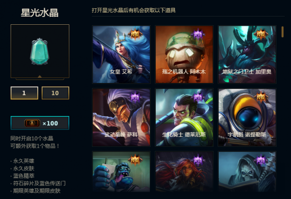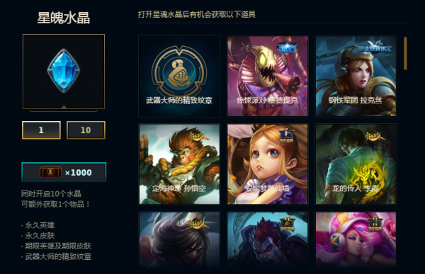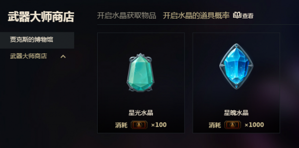如果你觉得商城中的皮肤对你没有吸引力,那么你也可以前往贾克斯的博物馆。这里有星光水晶和星魄水晶等你来抽,另外你在武器大师竞技场获得的所有奖励都会存放在博物馆里,需要领取的时候可以过来领取,不想要的道具可以合成。