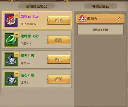 血精石是必上的,能够提升峨眉的血上限,而峨眉作为奶妈职业,自身的奶血量无疑是需要保证的,,因此最好打满。