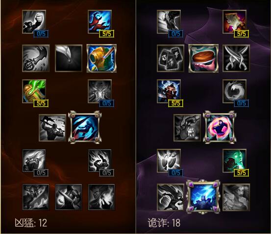 在诡诈系中,我们依然点出了雷霆。因为火男的定义还是一个爆发型AP,野蛮方便补刀饼干增加回复能力,死神和危险游戏都是标准配备。火男是一个比较依赖CD的英雄,所以天赋点出智谋让冷却上限提升到45%。