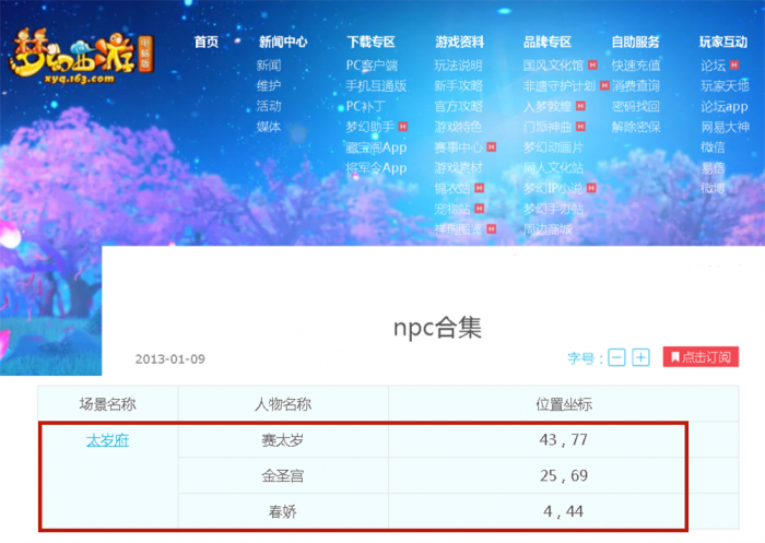 1.山太岁府有3个npc,分别是赛太岁(43,77)、金圣宫(25,69)、春娇(4,44)这三位NPC。玩家可以通过登录梦幻西游官方网站,查看官网在2013年发布的NPC合集,查询太岁府的NPC详情。