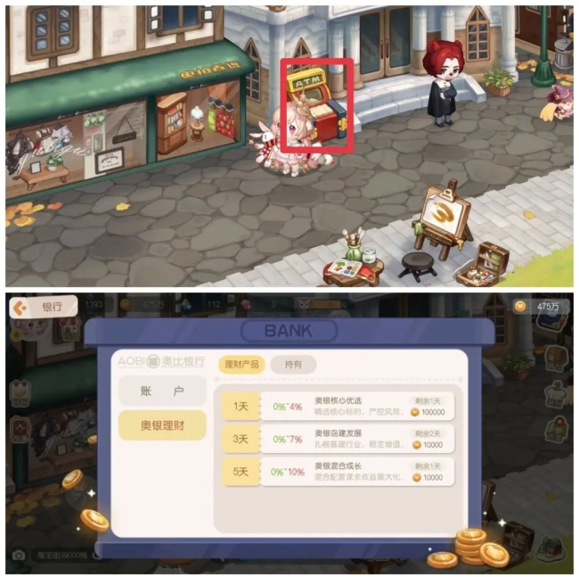 在淘宝街找龙娃投资,过一两天注意自己小岛海边会有小精灵带金币来;在淘宝街的ATM机可以购买不同种类多理财产品,建议期限为一天的可以多买点,万一有需要也可以及时取出来。