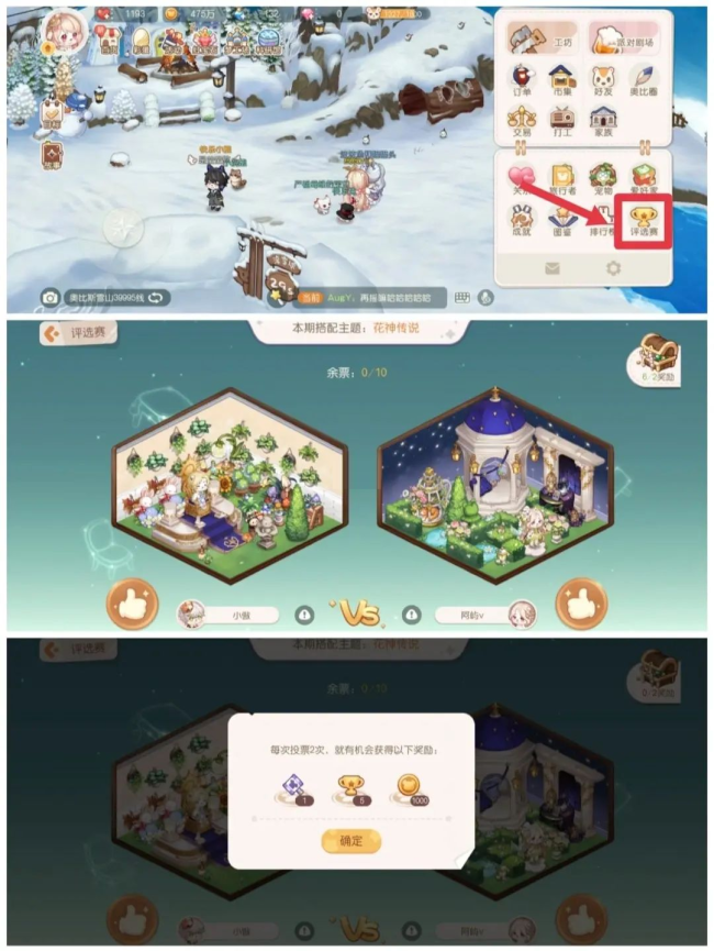 每天给评选赛投票可以获得晶钻锤子、小奖杯或者金币,每投两次可以随机获取一次,金币一份1000;
