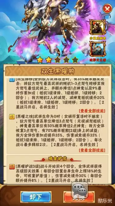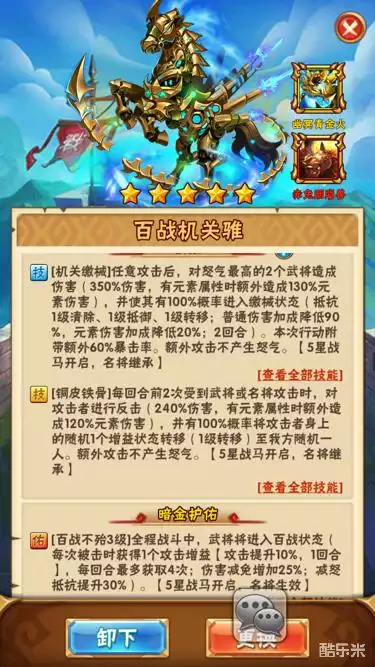 第二匹推出的暗金马,主要特色是受到攻击回复怒气,由于输出方面不是很强势,所以目前的情况大多是给副将佩戴,让副将有足够的怒气打出合击技能。作用略低于百战机关骓