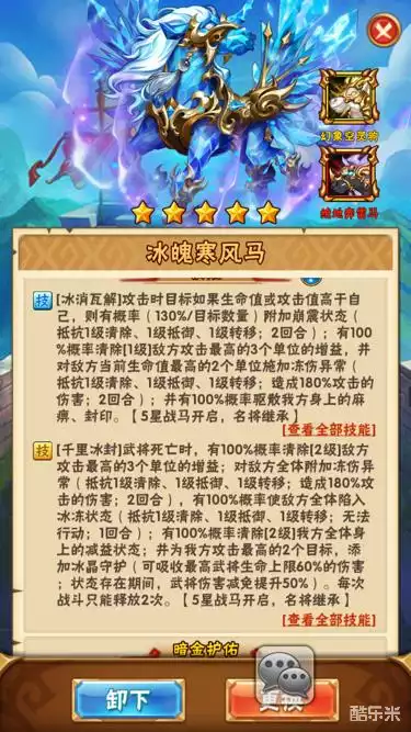 冰魄马地位类似于金色马时代的白骨狰狞马,有强大的控制技能,护佑技能加全体,死后给武将添盾牌,并且是以主力武将血量为标准的盾,有扭转战局的能力,性价比相当高。