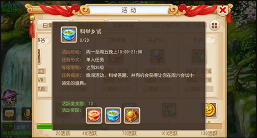 科举答题:时间是周一至周五的每晚七点在,不费吹灰之力就能得到一大堆经验,万一有不会的百度下就好了。