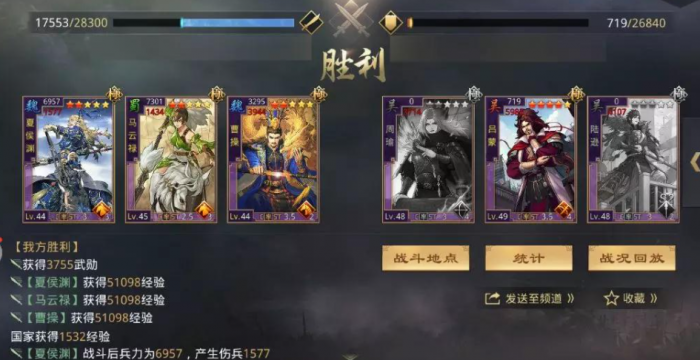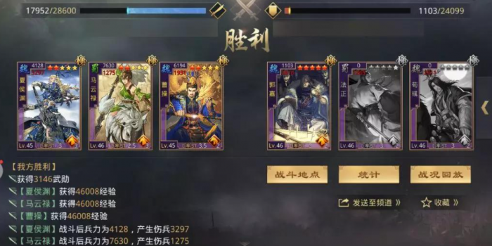 夏侯渊携带【一骑当千】+【折戟强攻】/【人中吕布】作为该套阵容的主要输出,舍弃了荀彧,获得了更大的增益。
