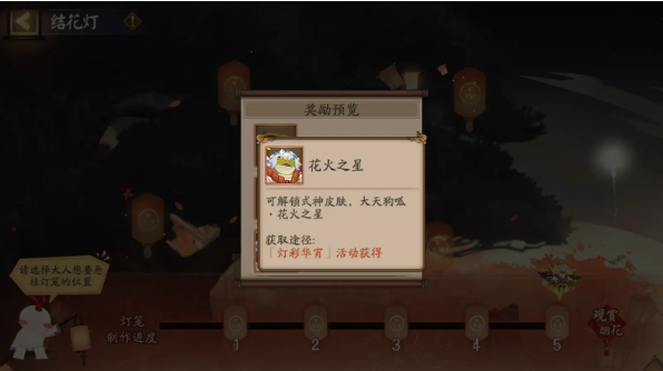 阴阳师们在「结花灯」中挂满五个花灯后,可领取大天狗呱皮肤·花火之星。