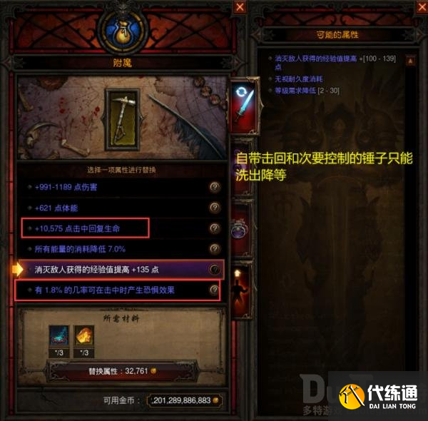 基于一级升级匕首的缘故,猎魔人的战斗技能选择要么刀扇要么暗影飞刀,这两个技能都可以用单手近战武器释放,所以我们选择白字波动最小的锤子作为主要武器。
