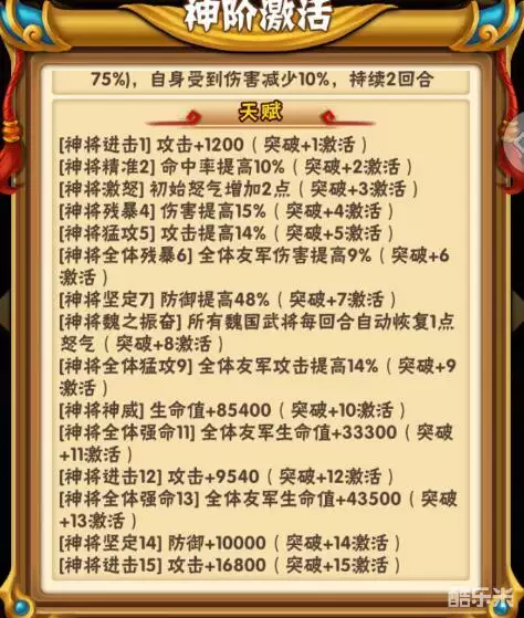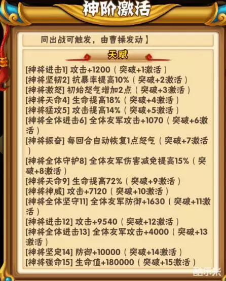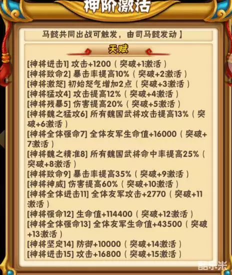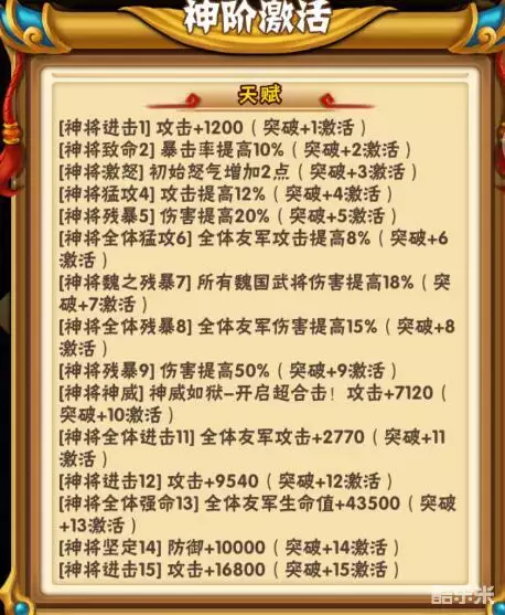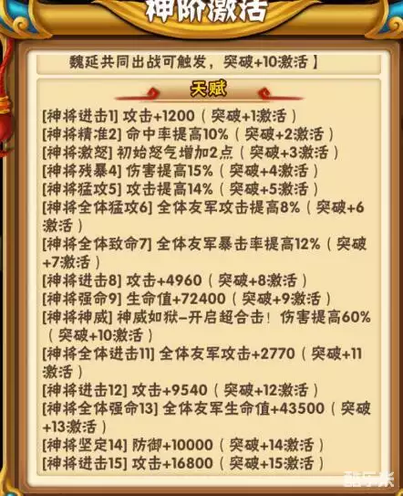 总输出能力提升:对魏国武将:攻击光环提升5%,残暴光环提升16.5%共计21.5%。