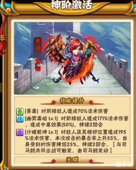 点评:光环极其霸道,对输出能力提升巨大!双吕布一波流可以考虑上他,但是司马懿作为核心武将,成本较高,所以并不普及。