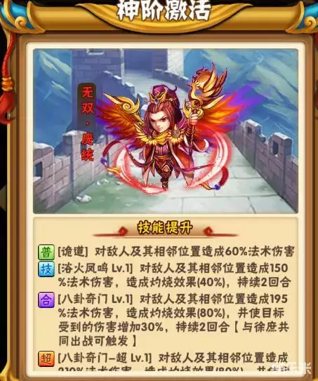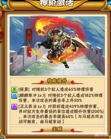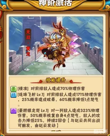点评:物美价廉的武将,很多蜀国玩家选择突10以后带一个黄忠来过渡,不过不得不说,黄忠的光环对输出提升真的很大!