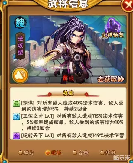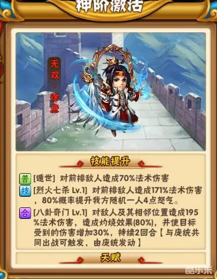 点评:蜀国战力高的根源之一,光环非常全能,战力提升也大,比荀彧强不少。