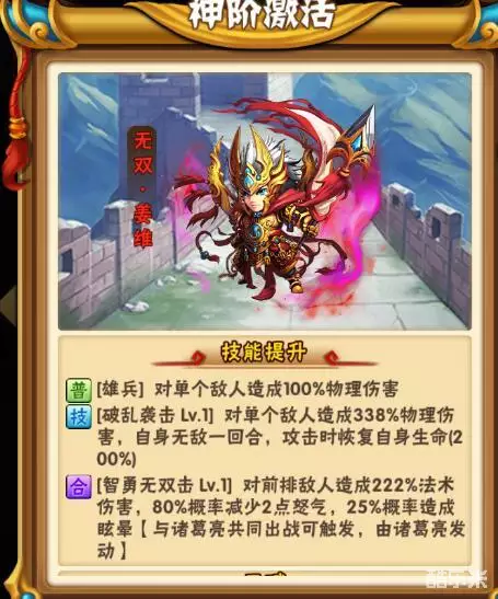 点评:光环真的很差劲……因为都是给自己加的,一般只有在5、6核的蜀国会考虑上姜维