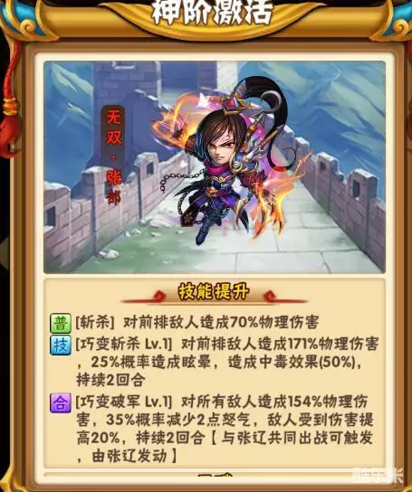 点评:魏国玩家之所以早早的就把张郃替换掉,就是因为其光环过于坑,基本无用。只有一个25%的灭吴有亮点,还基本作用不大……