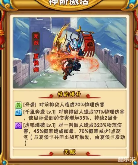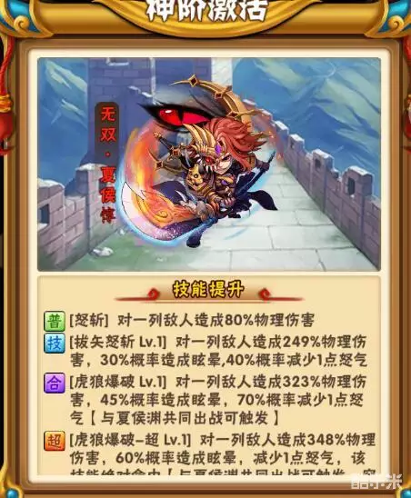点评:纯攻击光环,核心武将,成本较高,不是很普及,很多人看到这28%攻击光环就吓尿了,然后实际上由于不带残暴,总提升并没有期望的那么可怕。